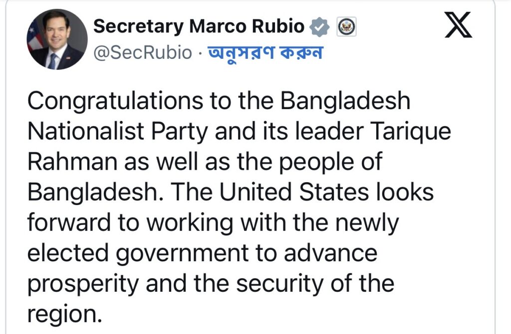 রুবিও তাঁর পোস্টে লেখেন, “বাংলাদেশ জাতীয়তাবাদী দল ও দলের নেতা তারেক রহমান এবং বাংলাদেশের জনগণকে অভিনন্দন।” তিনি আরও বলেন, এই অঞ্চলের সমৃদ্ধি ও নিরাপত্তা অগ্রসর করতে নবনির্বাচিত সরকারের সঙ্গে কাজ করতে যুক্তরাষ্ট্র আগ্রহী।