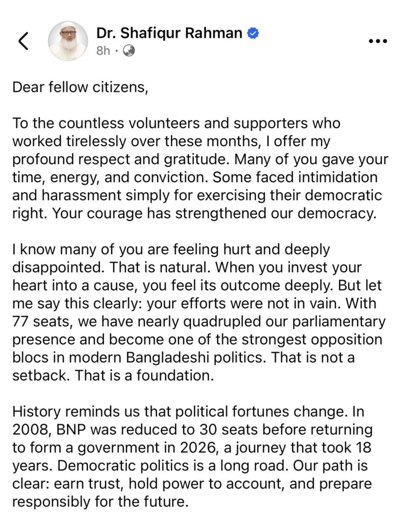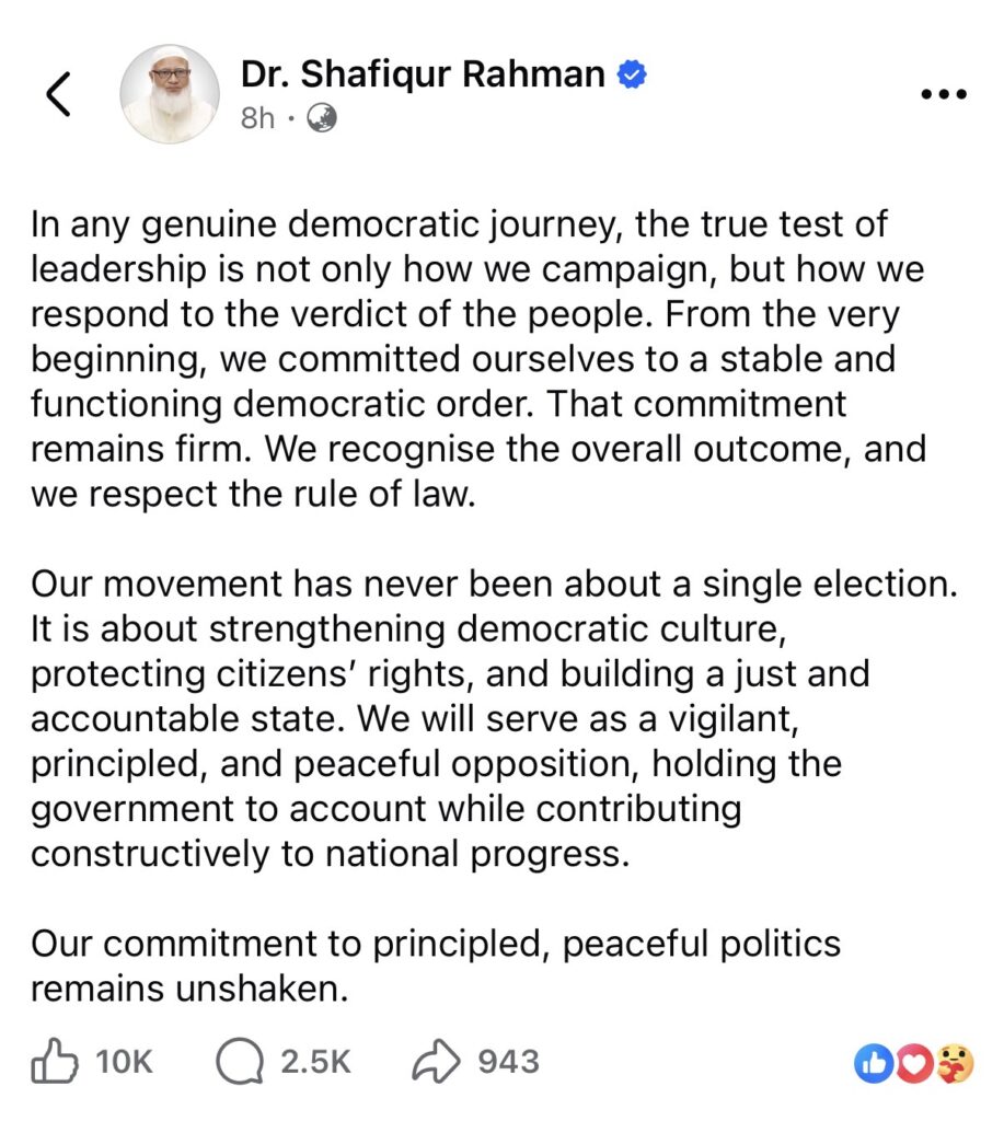 পোস্টে শফিকুর রহমান বলেন, শুরু থেকেই তারা একটি স্থিতিশীল ও কার্যকর গণতান্ত্রিক ব্যবস্থার প্রতি প্রতিশ্রুতিবদ্ধ ছিলেন এবং সেই অবস্থান থেকে সরে আসেননি। তিনি সামগ্রিক নির্বাচনী ফলাফলকে স্বীকৃতি দেওয়ার পাশাপাশি আইনের শাসনের প্রতি শ্রদ্ধা জানান।