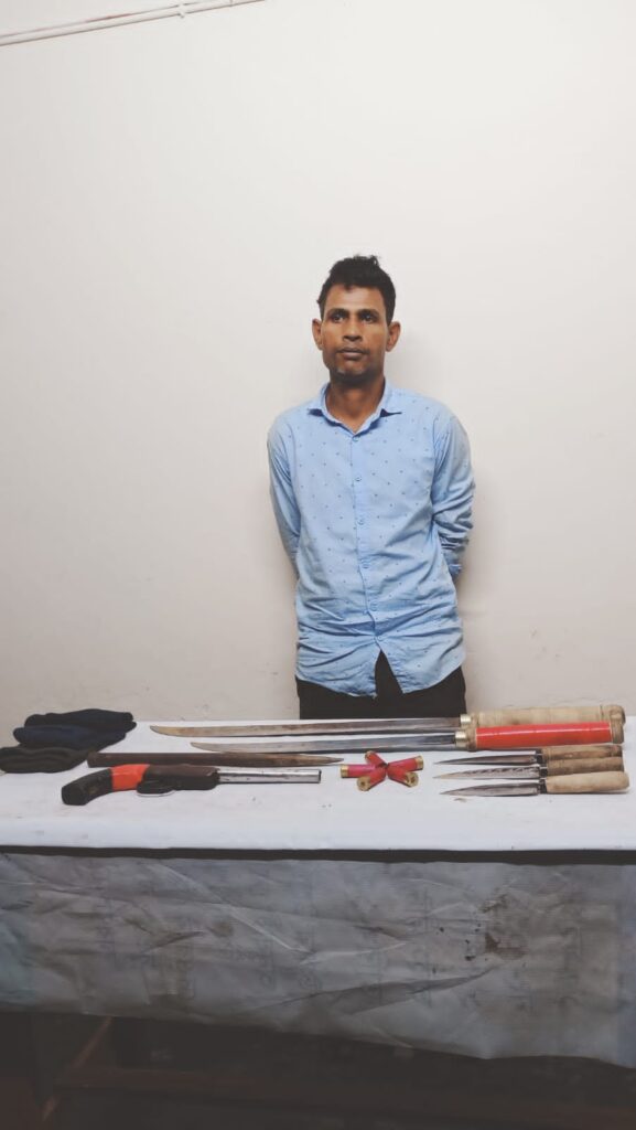 তল্লাশিতে তার কোমরের পেছনে প্যান্টের ভেতর লুকানো একটি দেশীয় তৈরি এলজি (অগ্নেয়াস্ত্র), প্যান্টের পকেটে ৫ রাউন্ড ১২ বোর লিডবল কার্তুজ, একটি ছাই রঙের মুখোশ উদ্ধার করা হয়।