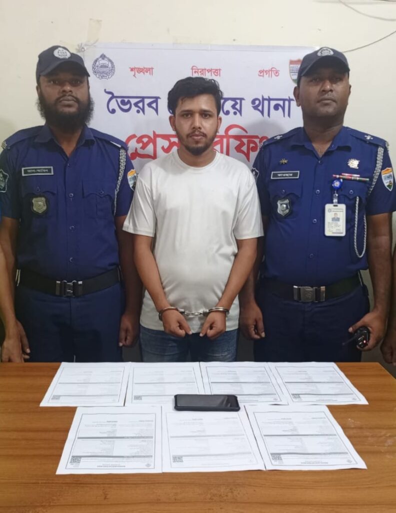 রেলওয়ে সূত্রে জানা যায়, শনিবার (১ জুন ২০২৫) সকাল ১০টায় ভৈরব রেলওয়ে স্টেশন এলাকায় গোপন তথ্যের ভিত্তিতে অভিযান চালিয়ে সৌরভ হোসেন (২৫) নামের এক টিকিট দালালকে হাতেনাতে গ্রেফতার করে কিশোরগঞ্জ রেলওয়ে পুলিশ।