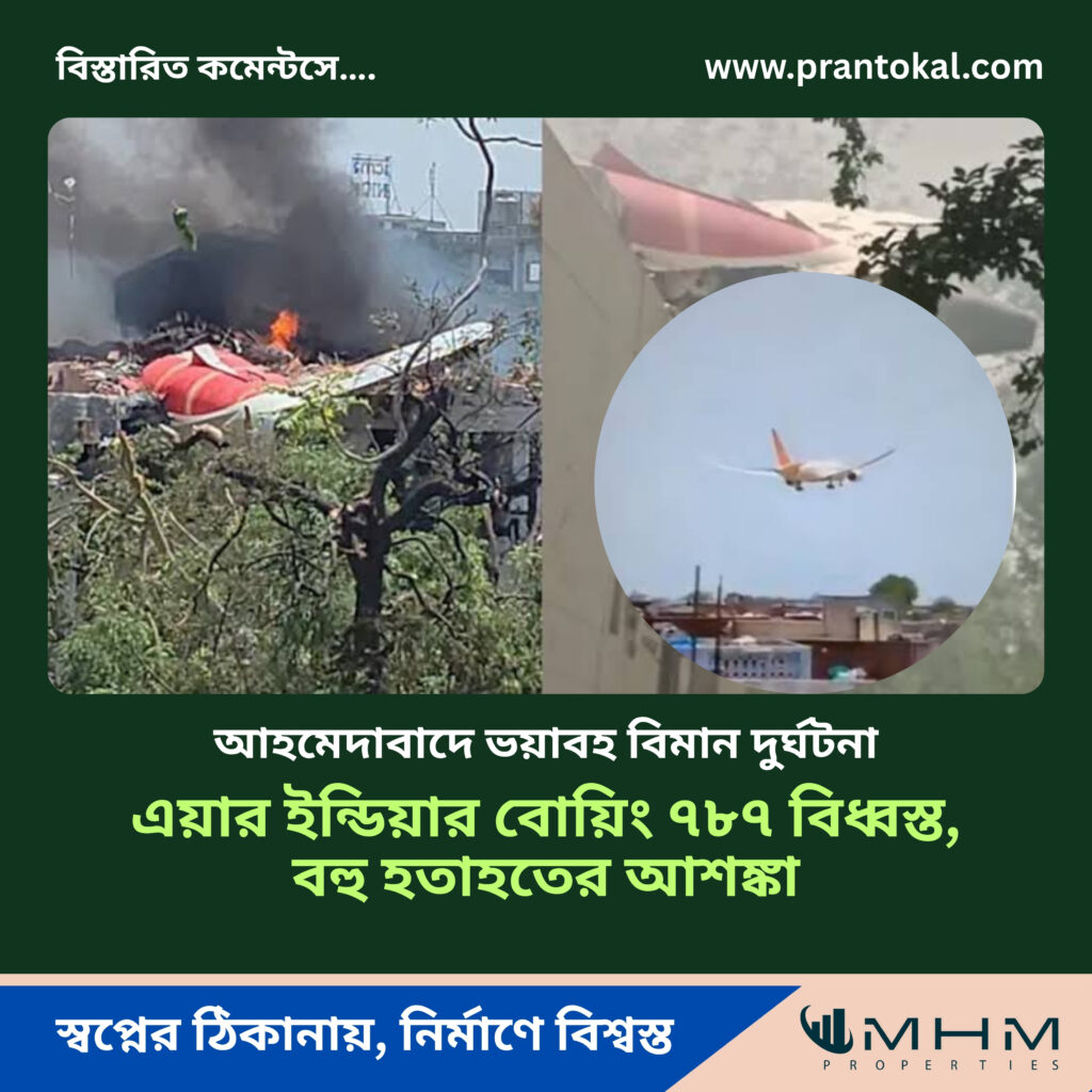 আহমেদাবাদে ভয়াবহ বিমান দুর্ঘটনা: এয়ার ইন্ডিয়ার বোয়িং ৭৮৭ বিধ্বস্ত, বহু হতাহতের আশঙ্কা