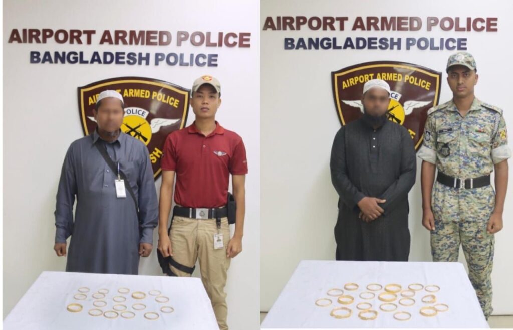 হযরত শাহজালাল আন্তর্জাতিক বিমানবন্দরে অভিযান চালিয়ে প্রায় ৯০০ গ্রাম স্বর্ণালঙ্কারসহ দুই ব্যক্তিকে আটক করেছে এয়ারপোর্ট আর্মড পুলিশ ব্যাটালিয়ন (এপিবিএন)। আটককৃতদের কাছ থেকে উদ্ধার হওয়া সোনার বাজারমূল্য প্রায় ১ কোটি ৭ লাখ টাকা।