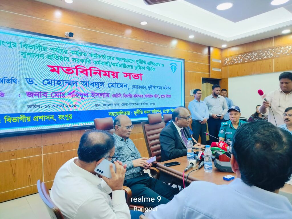 দুর্নীতি প্রতিরোধ ও সুশাসন প্রতিষ্ঠায় কর্মকর্তা-কর্মচারীদের ভূমিকা শীর্ষক মতবিনিময় সভা রংপুর জেলা প্রশাসক কার্যালয়ের সম্মেলন কক্ষে অনুষ্ঠিত হয়েছে। মঙ্গলবার (১২ আগস্ট) অনুষ্ঠিত এ সভায় প্রধান অতিথি ছিলেন দুর্নীতি দমন কমিশনের (দুদক) চেয়ারম্যান ড. মোহাম্মদ আবদুল মোমেন।