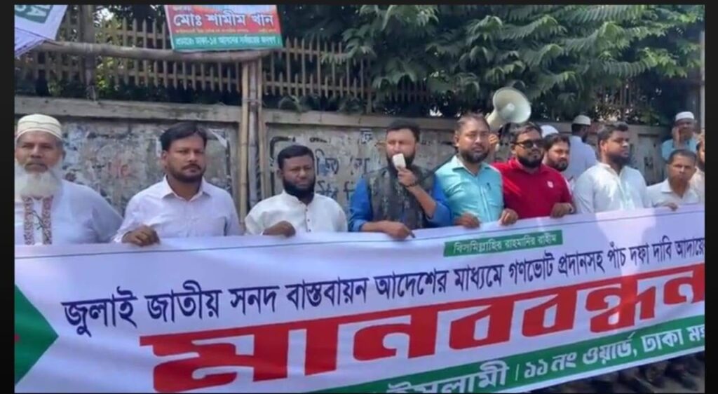 মানববন্ধনে মিরপুর, পল্লবী, দারুসসালামসহ আশপাশের এলাকার কয়েকশ নেতা-কর্মী অংশ নেন। তাঁরা ব্যানার, প্ল্যাকার্ড ও স্লোগানের মাধ্যমে সরকারের কাছে পাঁচ দফা দাবির তাৎক্ষণিক বাস্তবায়নের আহ্বান জানান।