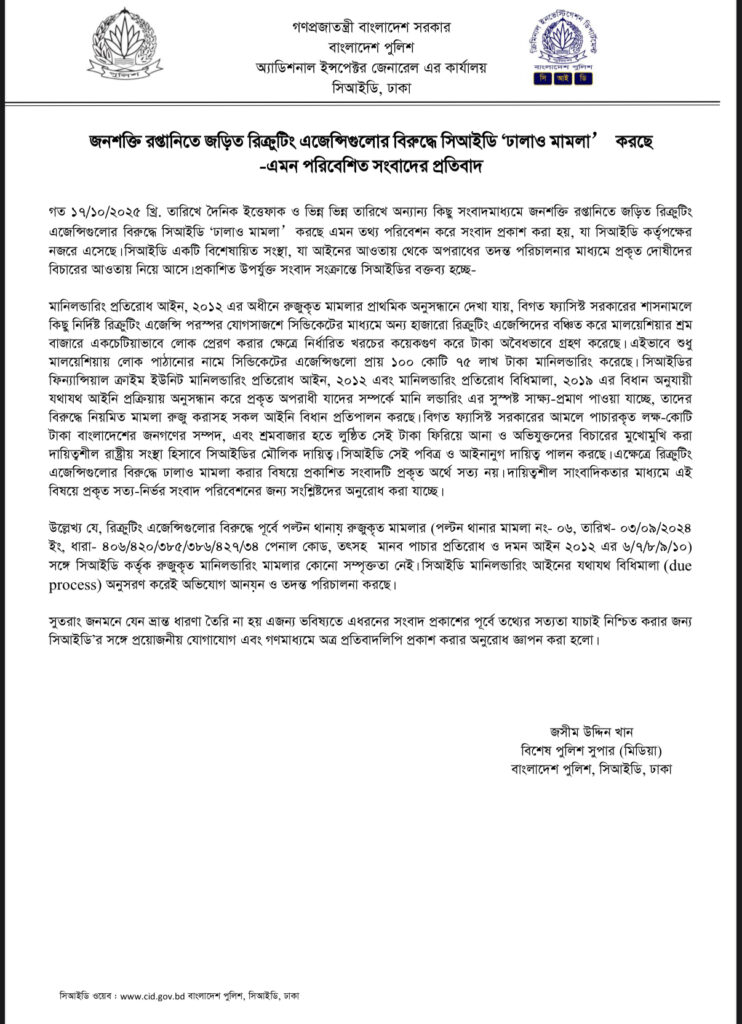 গত ১৭ অক্টোবর ২০২৫ তারিখে দৈনিক ইত্তেফাকসহ বিভিন্ন জাতীয় দৈনিক ও অনলাইন সংবাদমাধ্যমে “সিআইডি জনশক্তি রপ্তানিতে জড়িত রিক্রুটিং এজেন্সিগুলোর বিরুদ্ধে ঢালাও মামলা করছে” শিরোনামে সংবাদ প্রকাশিত হয়েছে, যা সিআইডির দৃষ্টিগোচর হয়েছে এবং সম্পূর্ণ বিভ্রান্তিকর ও বাস্তববিবর্জিত।